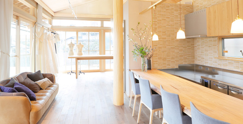 厳選された木材に、日差しが降り注ぐ大きな窓のある